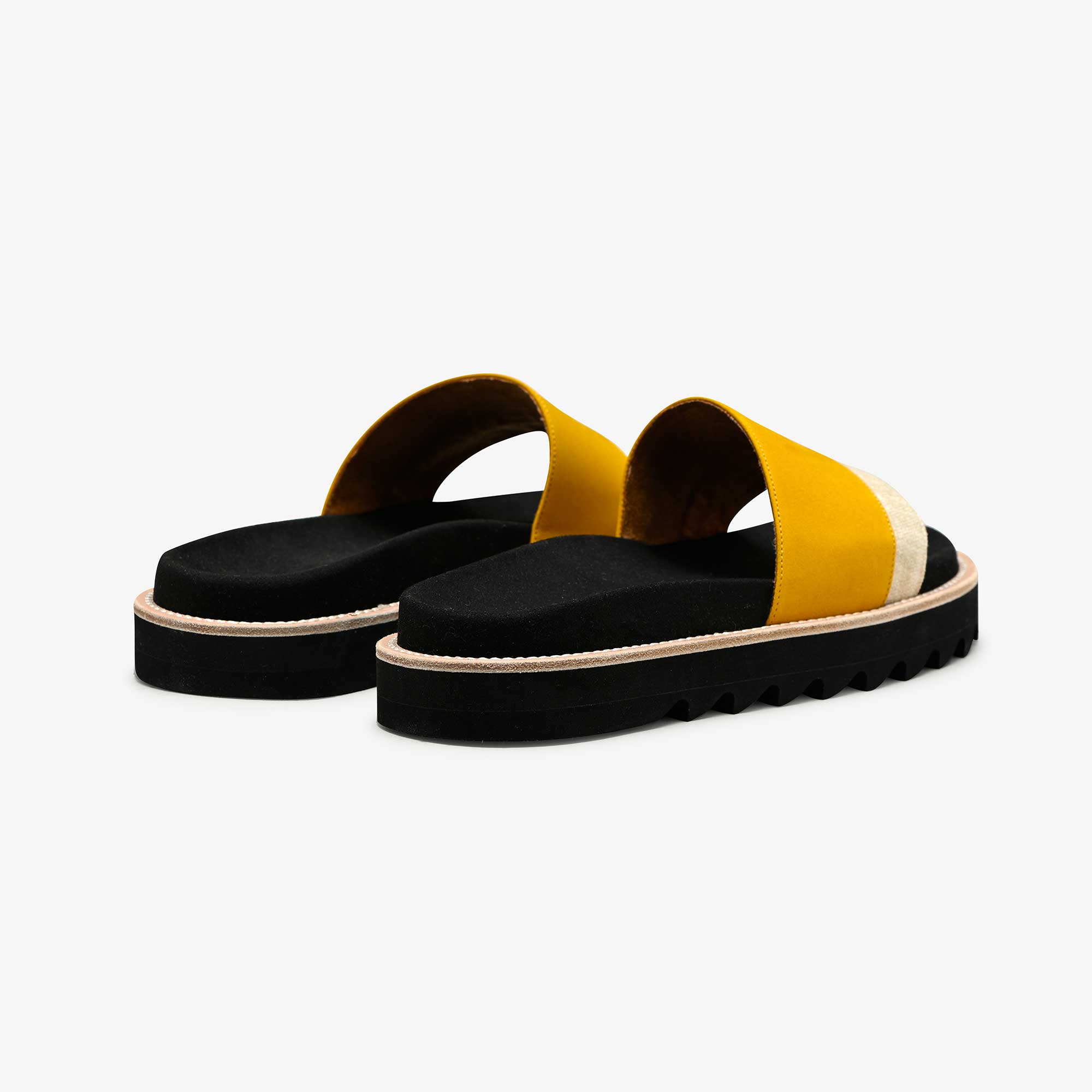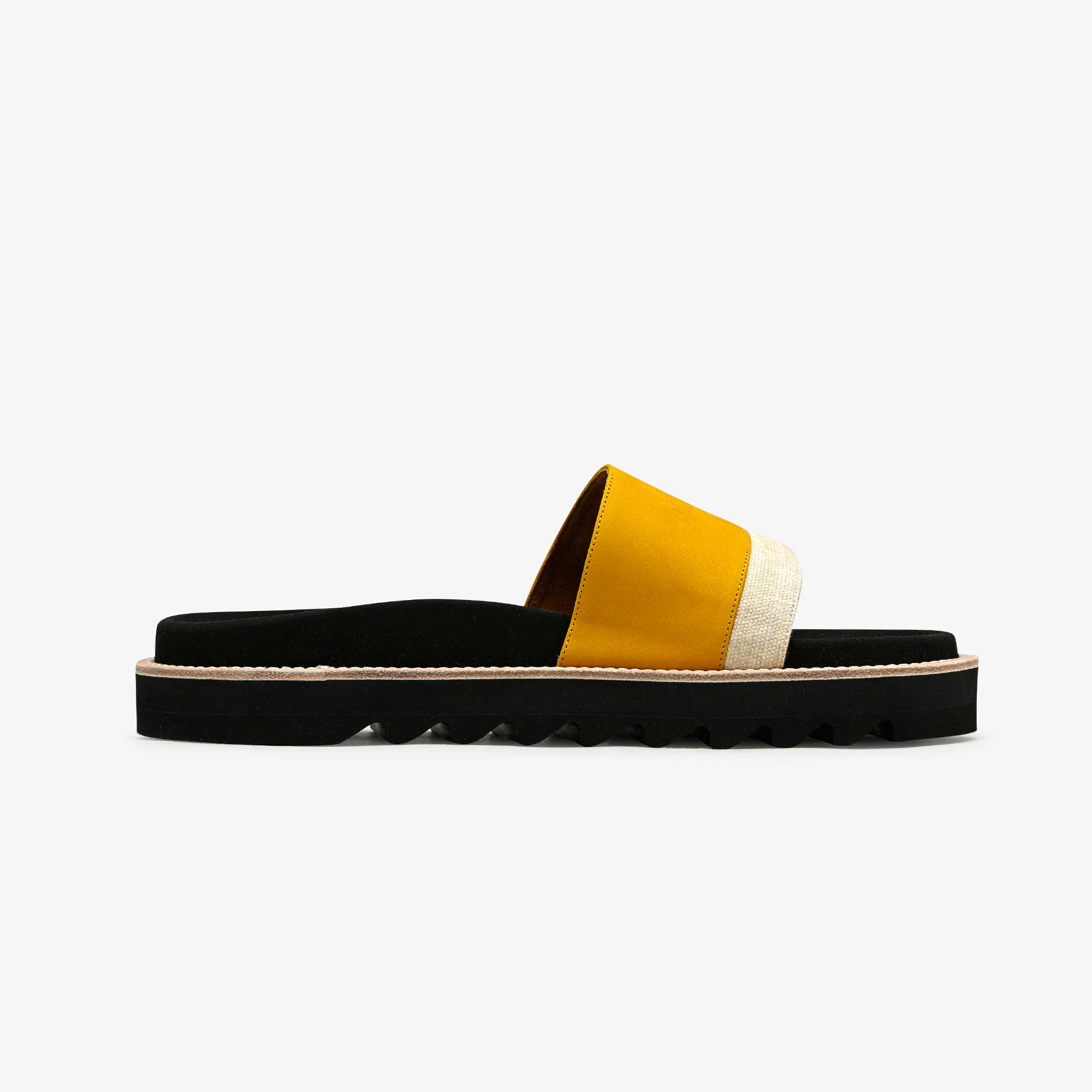 Nos Slides Femme sont montées sur une semelle au design original. L’empeigne est un jeu de contraste de matière mêlant le cuir végétal naturel, nubuck et vipère.